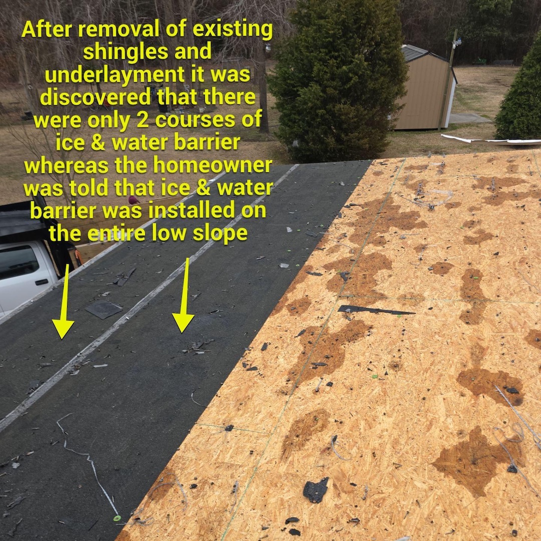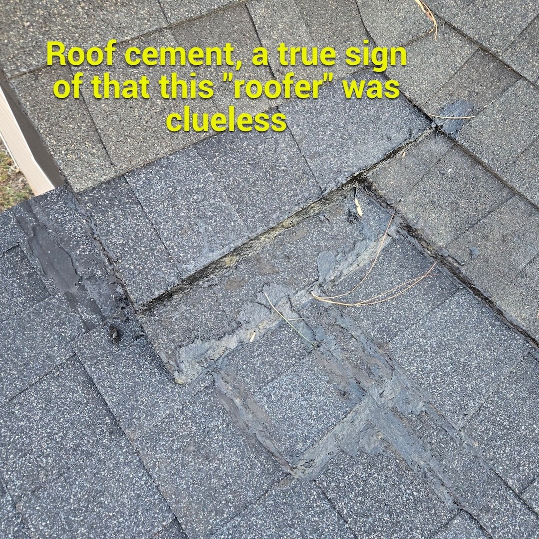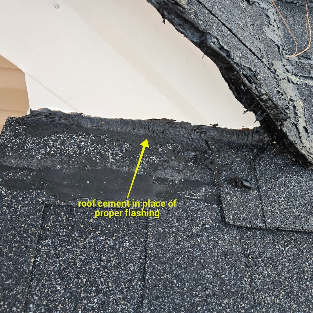 We inspected the roof the day after the homeowner contacted us and quickly identified the root of the issue. The porch roof had an extremely low slope of approximately 1/12, yet it had been installed with traditional asphalt shingles. Asphalt shingles are not designed to perform on roof pitches this low, which was the primary cause of the ongoing leaks. In addition, roof cement had been applied in an attempt to stop the leaks, but this was only acting as a temporary patch rather than a true solution.